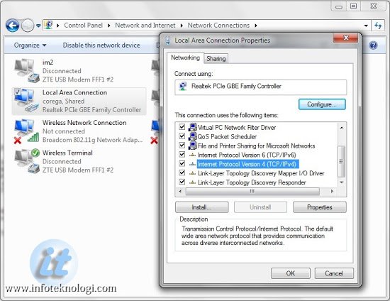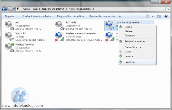 Klik kanan Local Area Connection atau Wireless Network Connection dan pilih Properties.