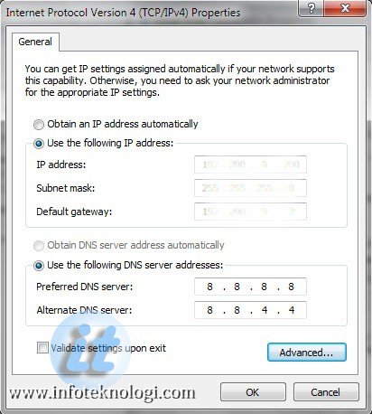 (Infoteknologi.com mengisinya dengan DNS dari Google, untuk DNS lain lihat di bagian akhir artikel)