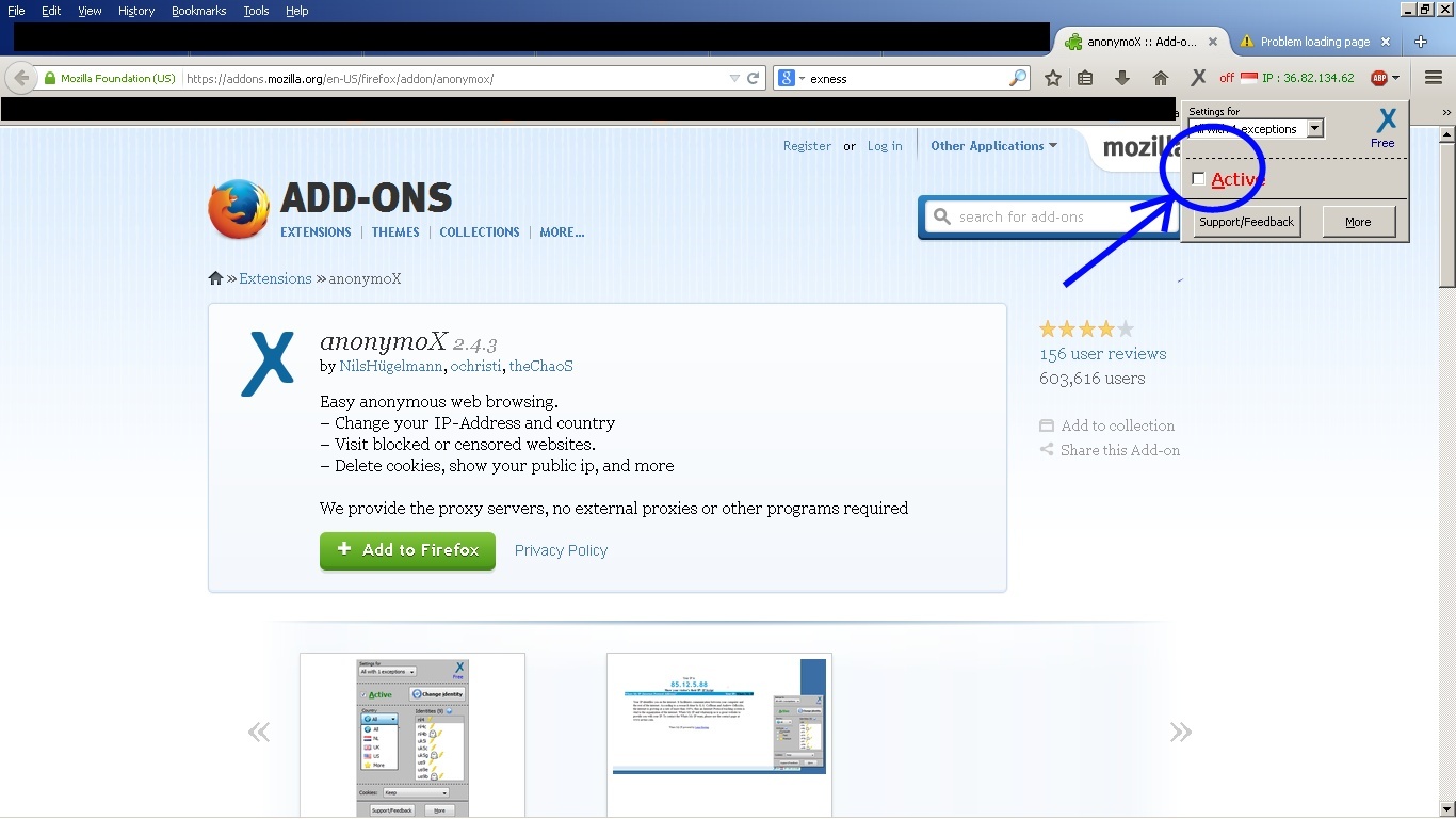Langkah 4 : Pastikan Anonymox sudah "Enable" di Mozilla