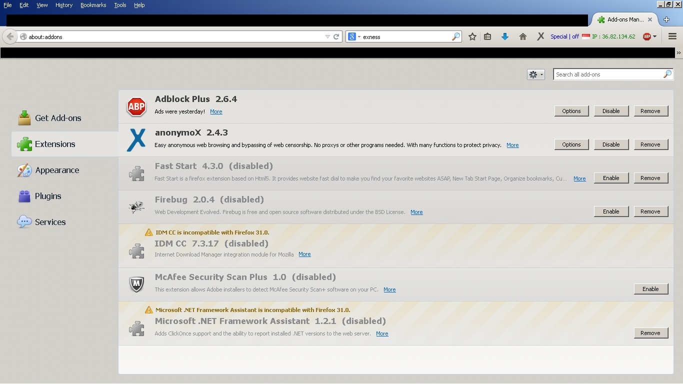 Atau check Klik Tools - Add-ons cari Anonymox lalu priksa apakah sudah Enable